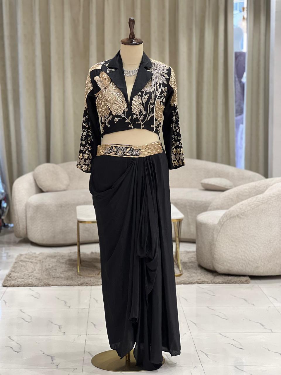 Black Embroidered jacket with a matching draped skirt.