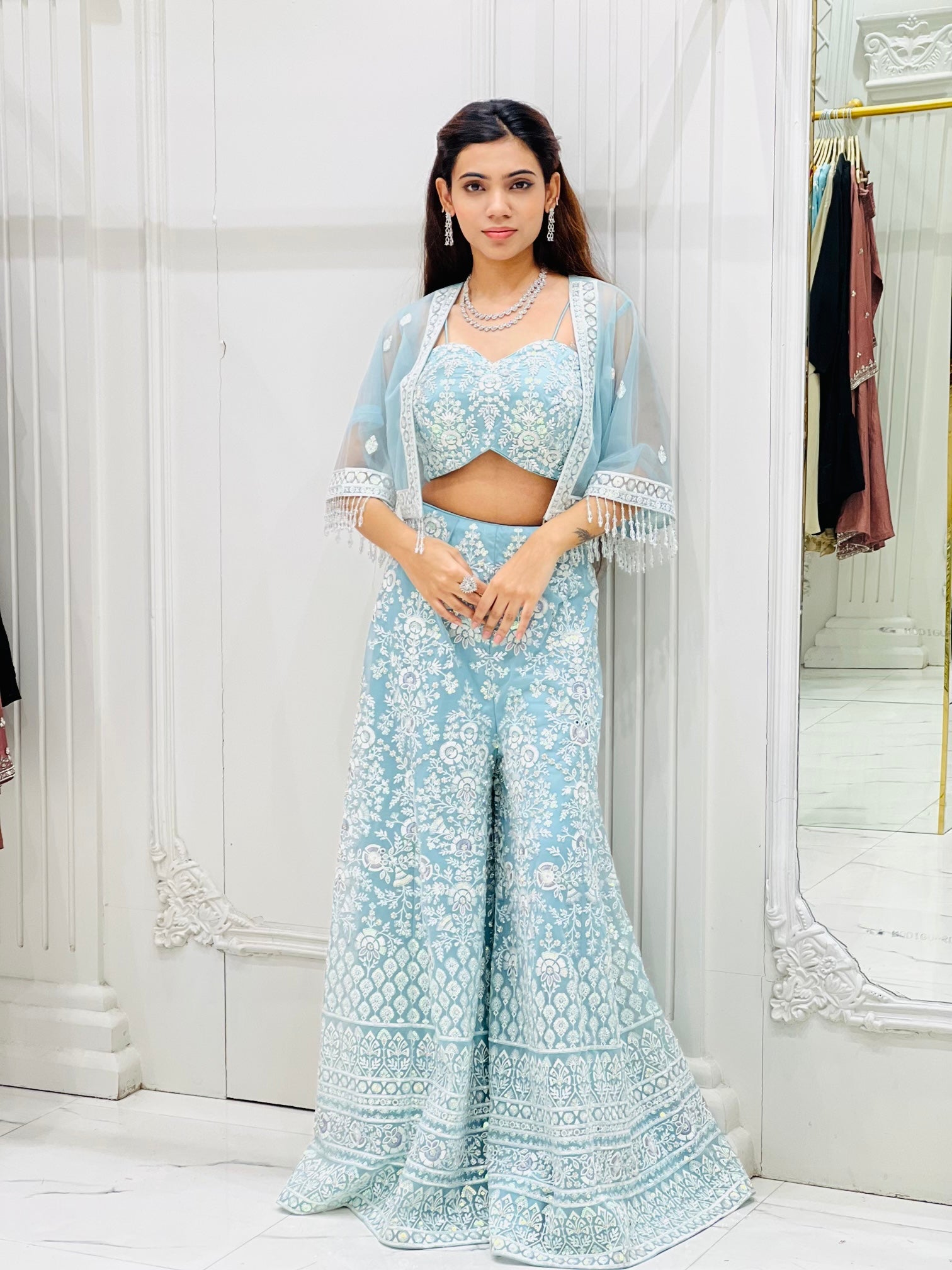 Embrace the perfect blend of tradition and trend with our Sky Blue Sharara Set in a New Updated Style. Designed in a refreshing pastel hue, this outfit features intricate embroidery that adds a touch of elegance and artistry. The contemporary silhouette of the sharara brings a modern twist, making it ideal for weddings, festive occasions, and grand celebrations. Stylish, graceful, and effortlessly chic—this is a statement ensemble for the modern woman.