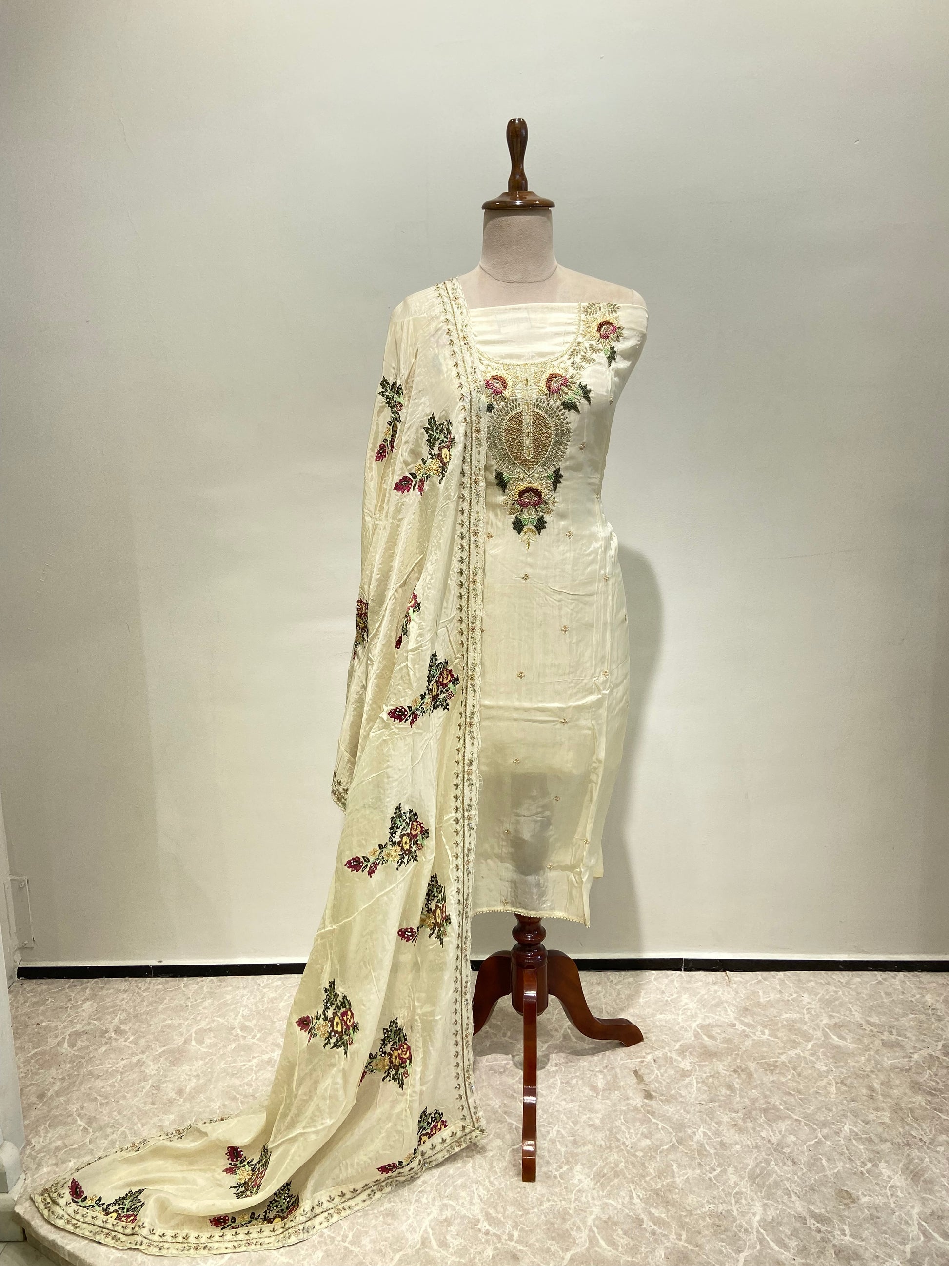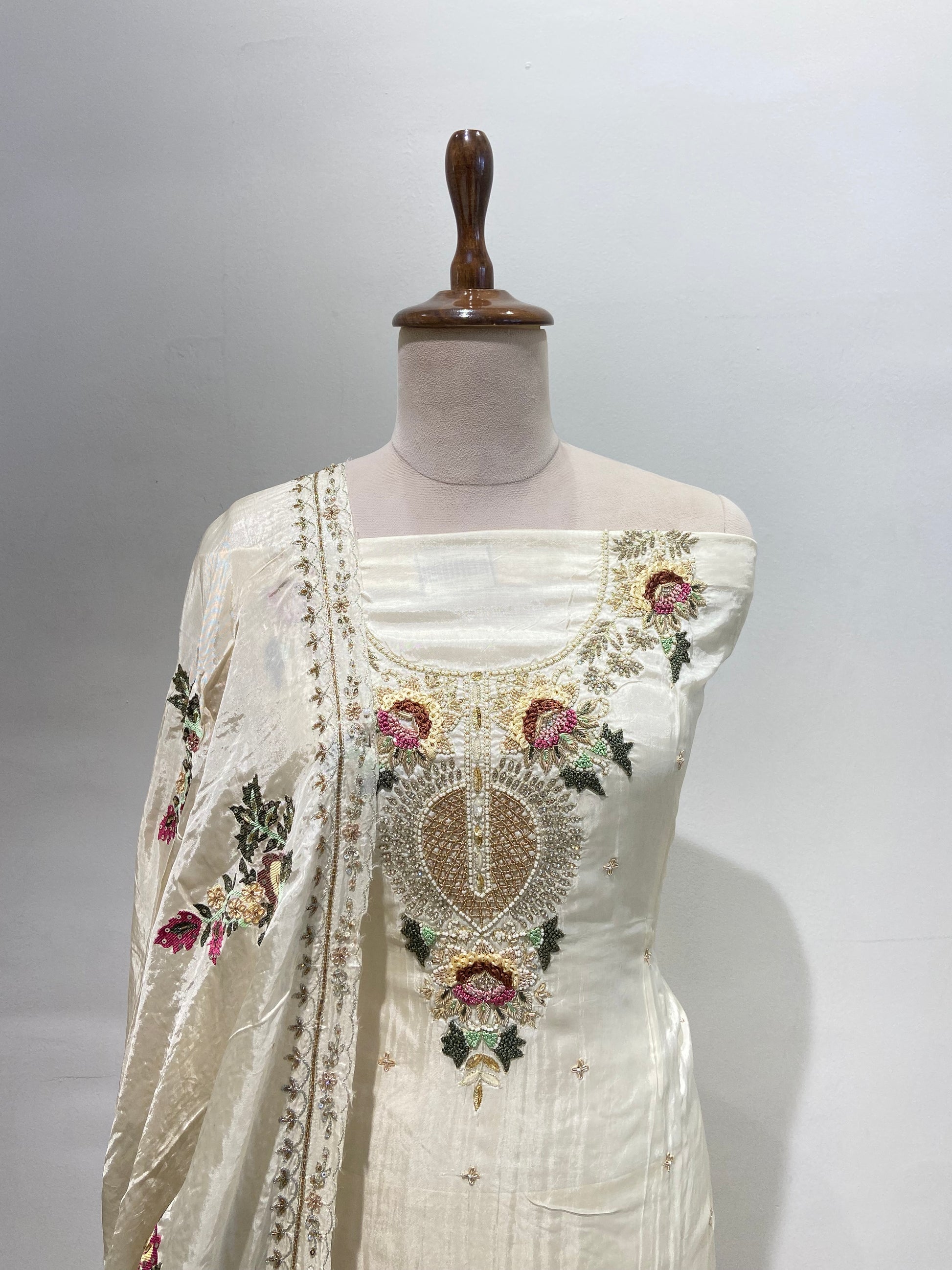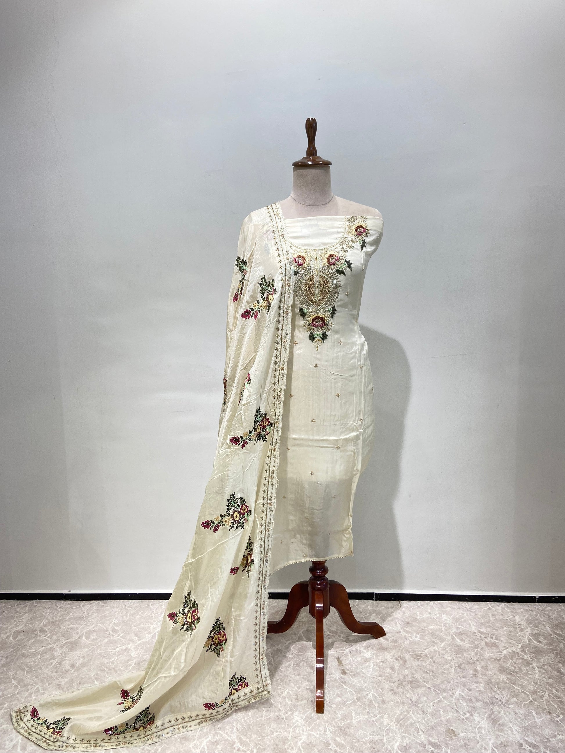 Hand zary embroiderd White suit set material with heavy work dupatta